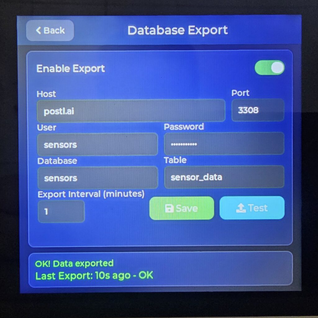 One of the most powerful features is the ability to export sensor data directly to a MariaDB or MySQL database. This enables: