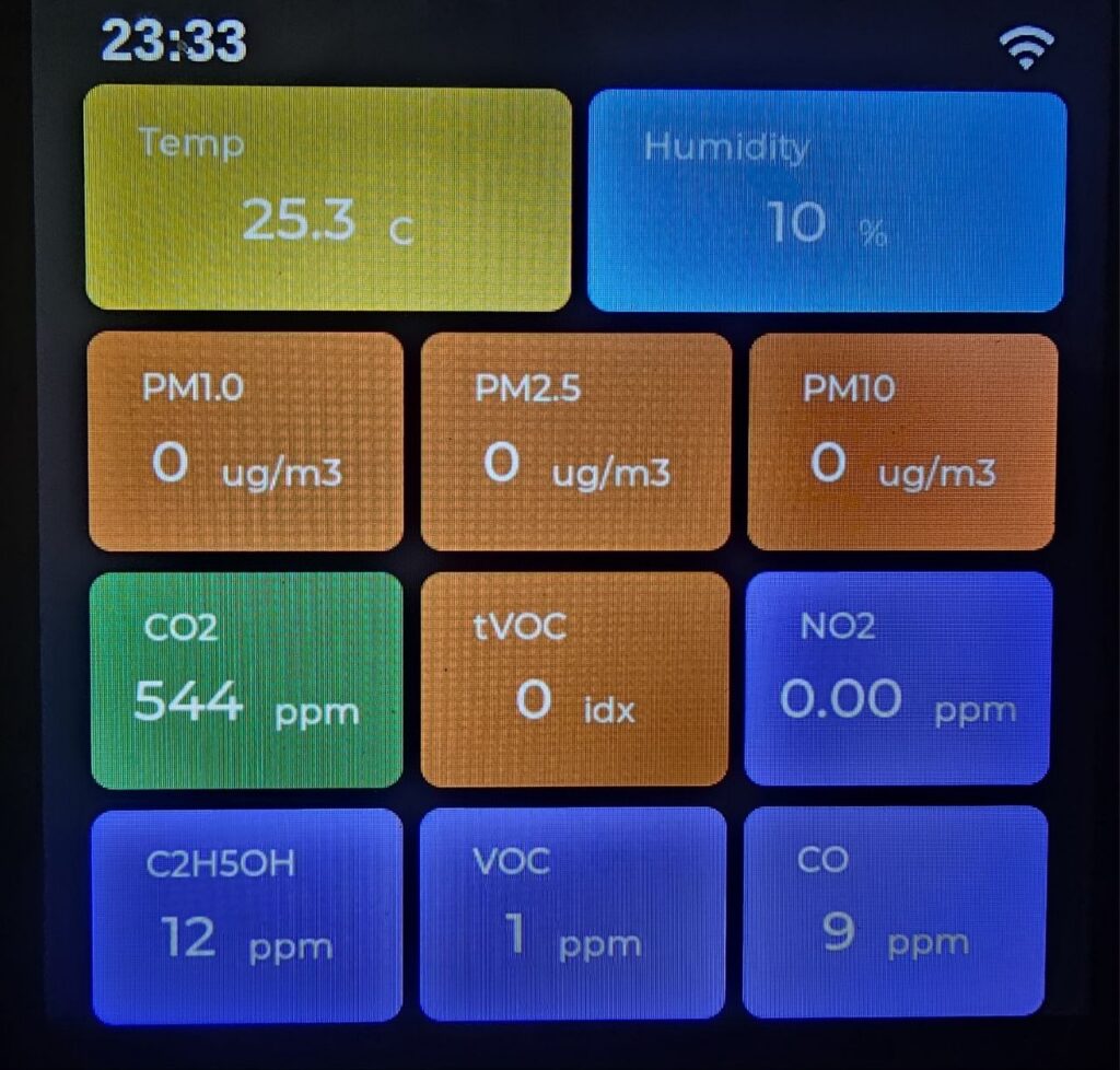The SenseCAP Indicator D1S, extended with additional Grove sensors and AI-programmed firmware, has become a powerful air quality monitoring station. It tracks particulate matter, multiple gases, CO2, temperature, and humidity — all displayed on a beautiful touch screen and optionally exported to a database.